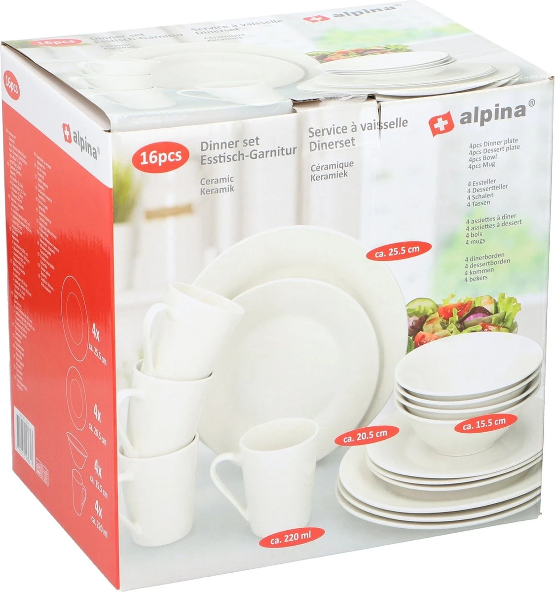 Deze set van Alpina bestaat uit 4 dinerborden, 4 dessertborden, 4 kommen en 4 bekers. Je mag dit servies gewoon in de vaatwasser zetten. Tevens geschikt voor de magnetron.
