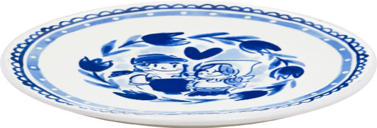 Ontbijtbord in de collectie Delfts Blond. Gekenmerkt door blauwe randen en midden op het bord illustraties van een stel en tulpen. Het ontbijtbord combineer je prima met de andere artikelen uit de Delfst Blondcollectie.