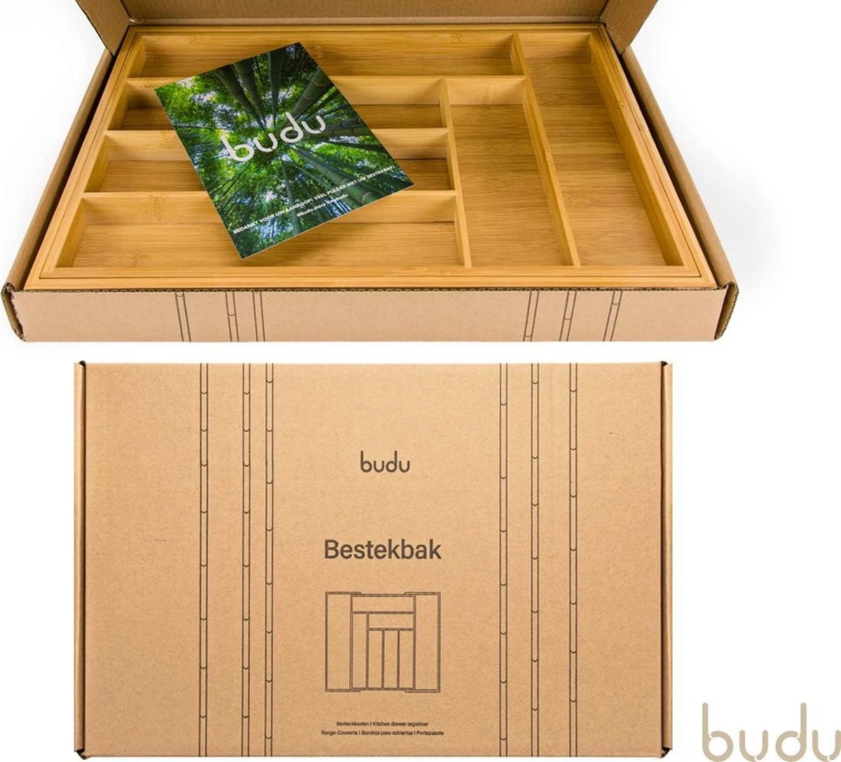 De Budu Bestekbak geeft uw besteklade een opgeruimde en luxe uitstraling. De bestekbak is gemaakt van 100% duurzaam bamboe. Bamboe is een zeer sterk en slijtvast materiaal. De bestekbak past in vrijwel elke lade, omdat hij in de breedte uitschuifbaar is. De bestekbak beschikt over maximaal 8 compartimenten, hierdoor kunt u al uw keukengerei netjes opbergen. De bestekbak is ook te gebruiken als organizer voor andere producten, zoals kantoorartikelen, gereedschap of make-up.