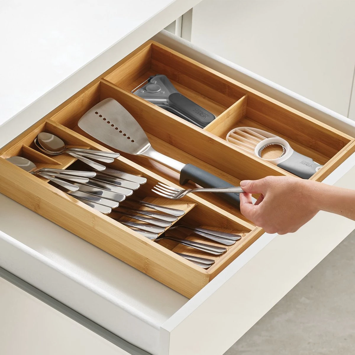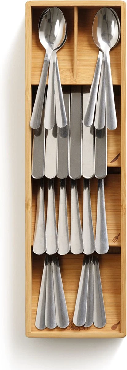Deze besteklade van Joseph Joseph is van duurzame kwaliteit en staat met zijn natuurlijke look mooi bij iedere soort keuken! Je hoeft je geen zorgen dat de bestek organizer gaat schuiven in je keukenlades: vanwege de anti-slip onderkant blijft de besteklade indeling namelijk netjes op zijn plek. De bestek organizer is er in twee varianten: