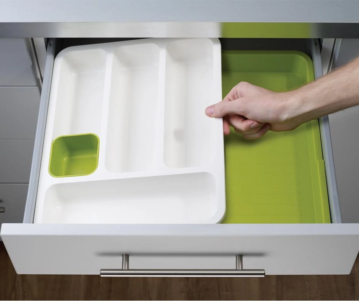 Je hoeft je niet meer af te vragen hoe je een keukenlade netjes kan inrichten met de uitschuifbare bestekbak van Joseph Joseph. Messen, lepels, vorken en grote opscheplepels: alles kan netjes worden geordend met de verstelbare bestekbak. Er is zelfs plek voor losse accessoires vanwege het kleine sorteerbakje. Je besteklade indeling is nog nooit zo geordend geweest!