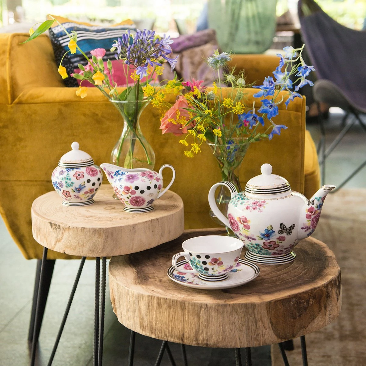 Melli Mello servies geeft elke tafel kleur en gezelligheid. De bloemenprint in combinatie met grafische zwart-wit strepen en gouden accenten geeft dit servies een eigenzinnig en fris uiterlijk en is zowel geschikt voor een moderne woonstijl als een klassiek interieur. Je kunt het servies eindeloos combineren. Fleur je witte servieskast op met de combinatie van zwart-witte polka dots en kleurrijke bloemen. Nodig jouw familie en vrienden uit voor een gezellig avondje tafelen met een prachtig sfeervol gedekte tafel.