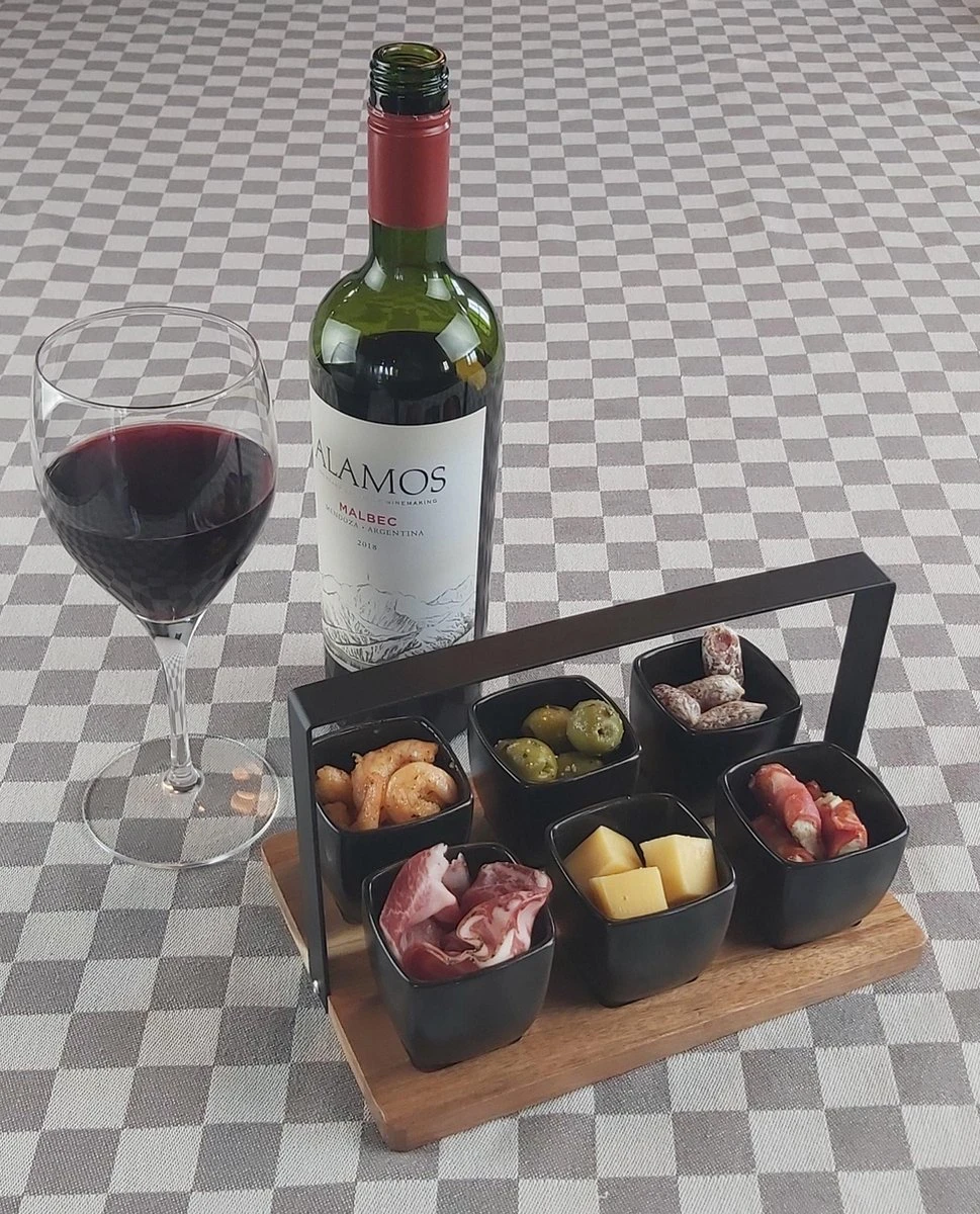 Mica Decorations – Luxe Tapas Set – 6 Zwarte Tapas Schaaltjes Op Houten Tapasplank – Servies – Borrelplank Olijfhout