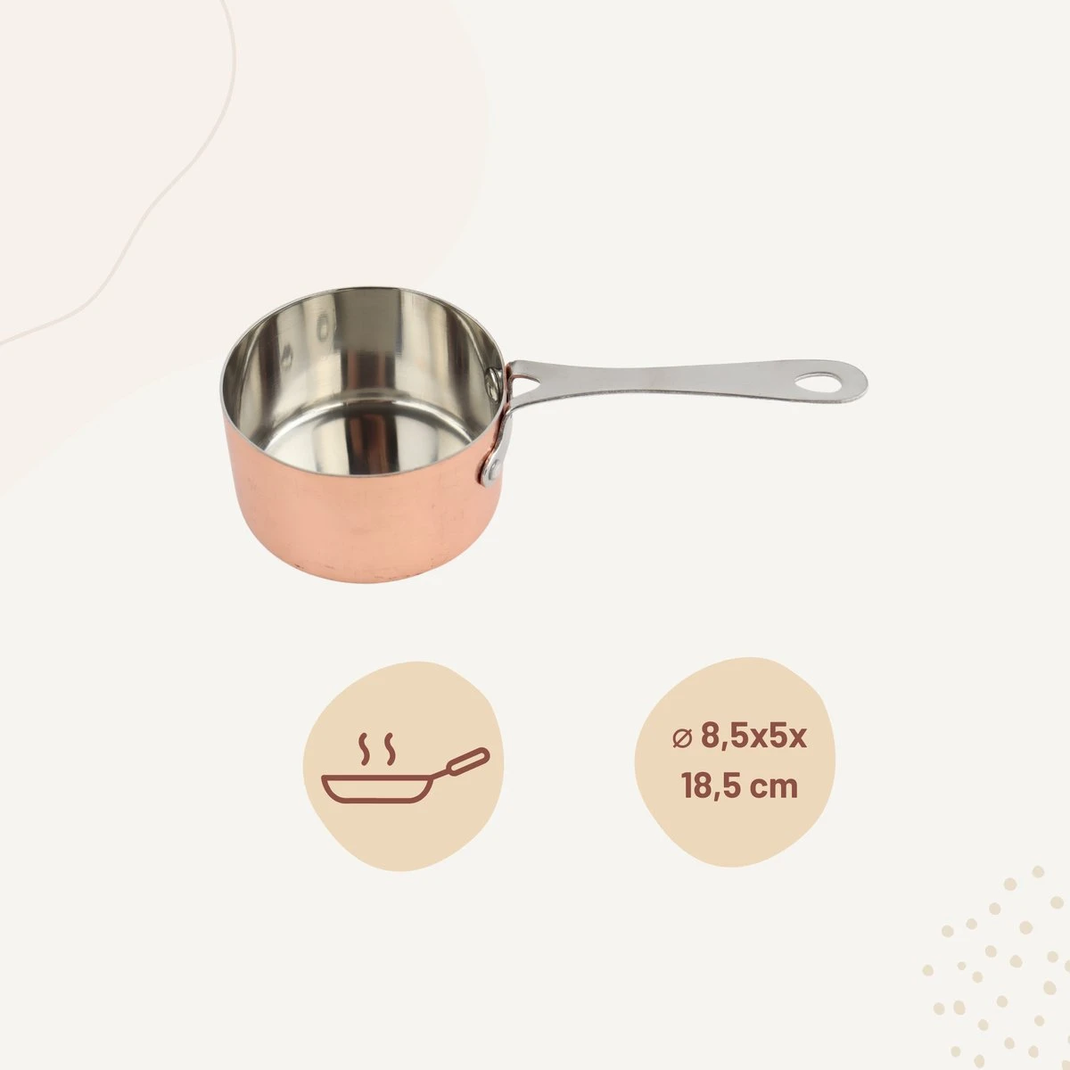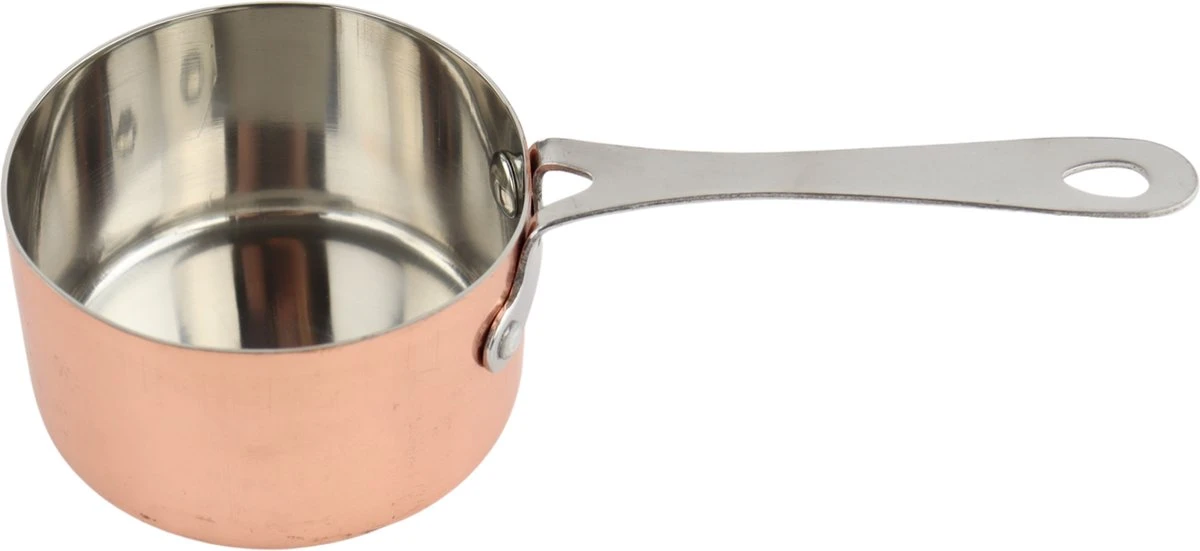 Het Orange85 sauspannetje heeft een koperen kleur. Het pannetje is geschikt voor het bereiden van sausen. De hoogte van de pan is 5 cm de diameter is 8,5 cm. Het is gemaakt van staal. De pan heeft een ronde vorm en een steel van 10,5 centimeter.