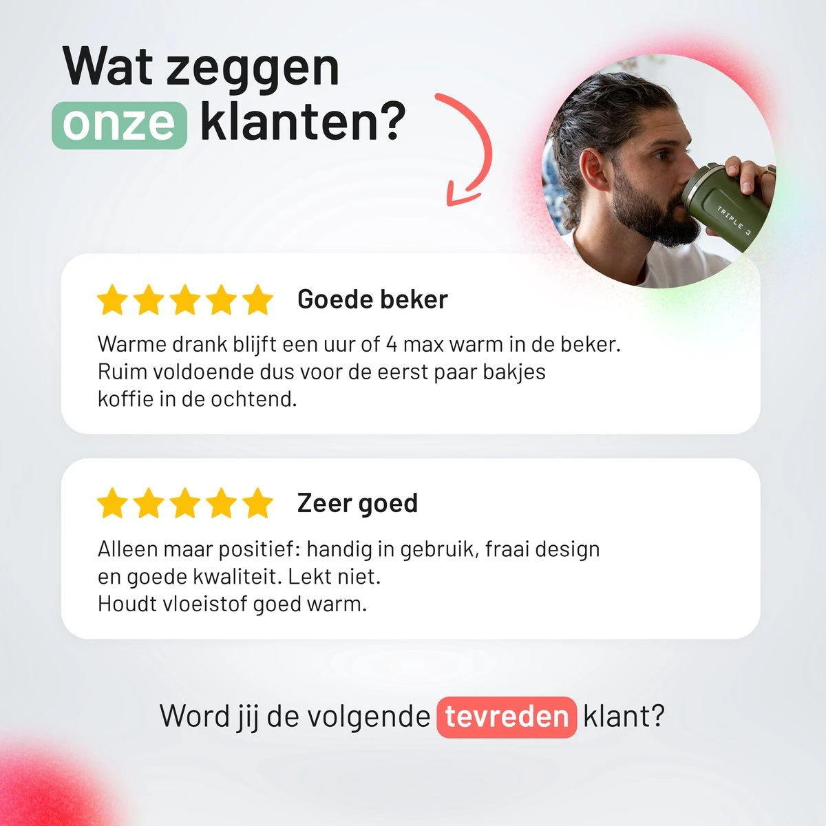De Triple J® Koffiebeker To Go wordt zeer gewaardeerd door gebruikers. Veel gebruikers waarderen de stijlvolle uitstraling, de goede isolatie en de handige afsluitbare deksel. Ook de anti-slip bodem wordt als zeer praktisch ervaren.